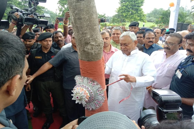 मुख्यमंत्री नीतीश कुमार ने वृक्षारोपण कर पेड़ो को राखी बांधी, जिसके बाद उन्होंने कहा कि आज रक्षा दिवस के मौके पर मैने कहा है कि बहन की रक्षा के लिए तो सभी ये त्योहार मनाते हैं लेकिन उसके साथ साथ वृक्ष की रक्षा भी होनी चाहिए।