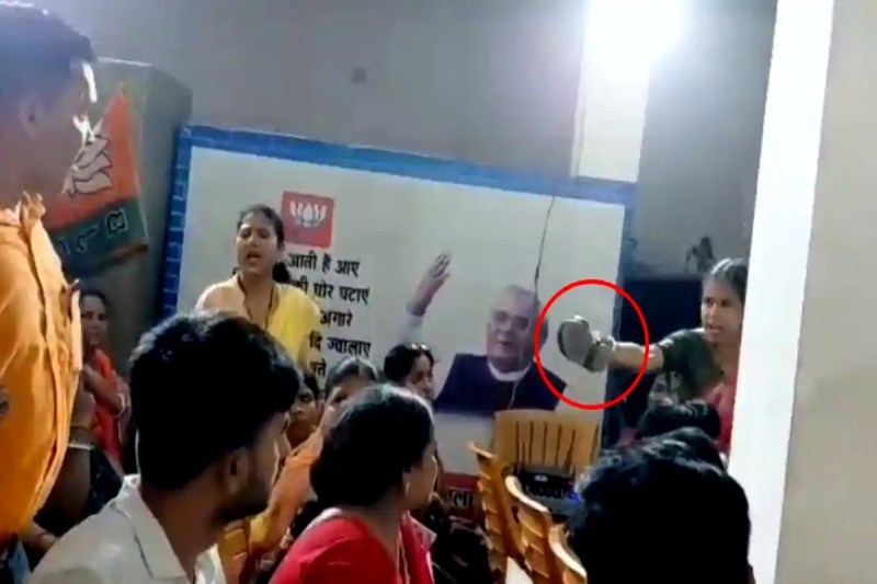 भाजपा के बैठक में महिला मोर्चा की जिलाध्यक्ष ने उठाई चप्पल (फोटो - वीडियो स्क्रीनशॉट Rashtriya Janata Dal X)