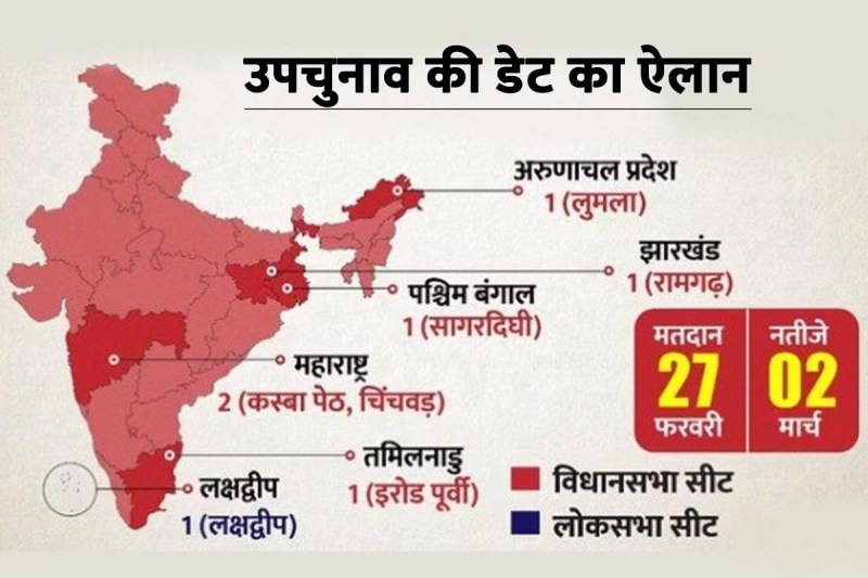 आज का दिन चुनावों की तारीखों के ऐलान का दिन रहा। पूर्वोत्तर के तीन राज्यों त्रिपुरा, मेघालय और नगालैंड के विधानसभा चुनाव की डेट और कार्यक्रम का ऐलान किया गया है। इसके साथ ही मुख्य चुनाव आयुक्त राजीव कुमार ने बुधवार को छह राज्यों की कुल सात विधानसभा और लोकसभा सीटों पर भी उपचुनाव की प्रक्रिया और तारीखों की घोषणा कर दी है। चुनाव आयोग ने 6 विधानसभा और 1 लोकसभा सीट पर उपचुनाव के लिए मतदान 27 फरवरी कराए जाएंगे। जिन सीटों के लिए उपचुनाव की घोषणा की गई है, उनमें अरुणाचल प्रदेश, झारखंड, पश्चिम बंगाल और तमिलनाडु की एक-एक विधानसभा सीट के साथ ही महाराष्ट्र की दो विधानसभा सीटें शामिल हैं। इसके अलावा केंद्र शासित प्रदेश लक्षद्वीप की एक लोकसभा सीट पर भी उपचुनाव की घोषणा की गई है।