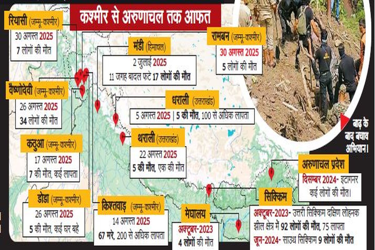 दर्जनों घर मलबे में तब्दील हो चुके हैं। बादल फटने के दौरान भूस्खलन से मकान ढहने से रियासी के माहौर डब्बर गांव में एक ही परिवार के पांच बच्चों समेत सात लोगों की मौत हो गई। वहीं रामबन के राजगढ़ गांव में बादल फटने से आए तेज बहाव में चार लोगों की मौत हो गई। कई मकान बह गए। आस-पास के अन्य गांव भी तबाही की चपेट में आ गए। सूचना मिलने पर सेना व आपदा-बचाव दल मौके पर पहुंचे और पीडि़तों के राहत देने का कार्य शुरू किया। देश में अगस्त माह में जम्मू कश्मीर में बादल फटने की यह चौथी और हिमालय रेंज में बादल फटने की छठी बड़ी तबाही है। पिछले सालों में भी हिमालय रेंज के जम्मू-कश्मीर, उत्तराखंड, हिमाचल प्रदेश, लद्दाख, सिक्किम, अरूणाचल प्रदेश, मेघालय राज्य तक तबाही की घटनाएं होती रही है।