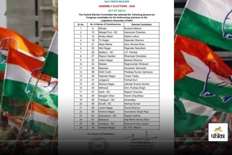 रिठाला विधानसभा से सुशांत मिश्रा, मंगोलपुरी (एस.सी) से हनुमान चौहान और शकूरबस्ती विधानसभा सीट से सतीश लूथरा को टिकट दिया है। इसके अलावा त्रिनगर विधानसभा सीट से सतेंद्र शर्मा, मटिया महल से आसिम अहमद खान, मोती नगर से राजेंद्र नामधारी, मादीपुर (एससी) से जे.पी.पंवार, राजौरी गार्डन से धर्मपाल चंदेला, उत्तम नगर से मुकेश शर्मा, मटियाला से रघुविंदर शौकीन, बिजवासन से देवेंद्र सहरावत और दिल्ली कैंट से प्रदीप कुमार उपमन्यु को मैदान में उतारा है। पार्टी ने राजेंद्र नगर से विनीत यादव, जंगपुरा से फरहद सूरी, मालवीय नगर से जितेंद्र कुमार कोचर, महरौली से पुष्पा सिंह, देवली (एससी) से राजेश चौहान, संगम विहार से हर्ष चौधरी, त्रिलोकपुरी (एससी) से अमरदीप, कोंडली (एससी) से अक्षय कुमार, लक्ष्मी नगर से सुमित शर्मा, कृष्णानगर से गुरुचरण सिंह राजू, सीमापुरी (एससी) से राजेश लिलोठिया, बाबरपुर से हाजी मोहम्मद इशराक खान, गोकलपुर (एससी) से प्रमोद कुमार जयंत और करावल नगर विधानसभा सीट से डॉ. पी.के. मिश्रा को टिकट दिया है। इससे पहले कांग्रेस ने कुल 21 उम्मीदवारों के नाम घोषित किए थे।
