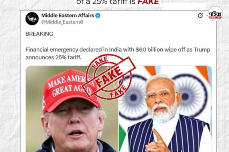 पाकिस्तान प्रोपेगेंडा फैला रहा है कि भारत की मोदी सरकार (Modi Government) अमेरिकी टैरिफ से घबरा गई है। पाकिस्तानी अकाउंट ने दावा किया है कि मोदी सरकार ने आर्थिक अपातकाल लागू कर दिया है। देश का 60 बिलियन डॉलर का बाजार जल्द ही तबाह होने वाला है। PIB ने वायरल दावे को सिरे से खारिज किया है। प्रेस इंफोर्मेशन ब्यूरो ने कहा कि सोशल मीडिया पर वायरल हो रहा दावा भ्रामक है। भारत में किसी भी तरह का आर्थिक आपातकाल घोषित नहीं किया गया है। PIB ने लोगों को सलाह दी है कि वह सिर्फ आधिकारिक स्त्रोतों से जारी होने वाली खबरों पर भरोसा करें।