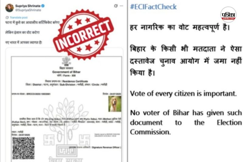 Fact Check: बिहार में हाल ही में एक अजीबोगरीब मामला सामने आया है, जहां एक डॉग के नाम पर ‘डॉग बाबू’ नाम से एक निवास प्रमाण पत्र जारी कर दिया गया। इस निवास प्रमाण पत्र में डॉग के माता-पिता का नाम भी लिखा था। इसका फोटो सोशल मीडिया पर काफी वायरल हुआ था। अब चुनाव आयोग ने इसको लेकर सच्चाई बता दी है। चुनाव आयोग ने इसका खंडन कर दिया है ।