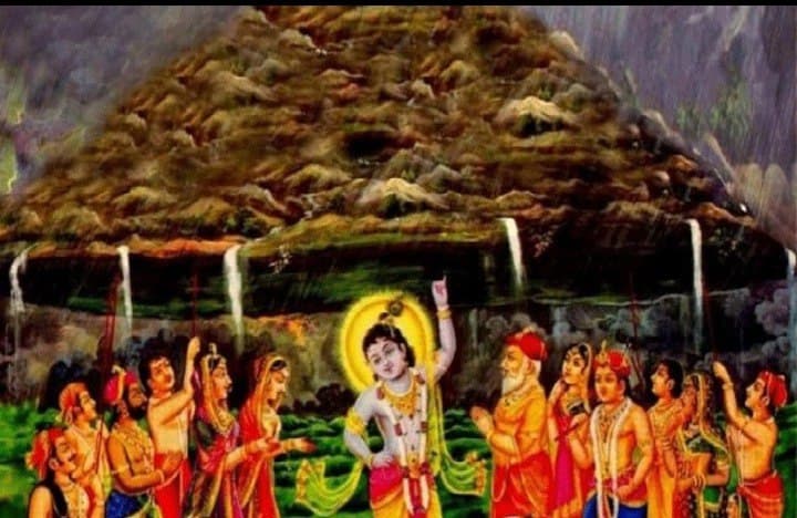 मान्यता है कि देवराज इंद्र को खुद पर अभिमान हो गया था। इस घमंड को दूर करने के लिए भगवान ने एक लीला रची। एक दिन उन्होंने देखा कि गांव के सभी लोग बहुत सारे पकवाने बनाते हुए किसी की पूजा की तैयारी कर रहे हैं। बाल कृष्ण ने अपनी मैया से इस बारे में प्रश्न किया तो उन्हें पता चला कि ये सब देवता इंद्र को प्रसन्न करने के लिए किया जा रहा है, जिससे वे आशीर्वाद के तौर पर बारिश करें और अन्न की पैदावार हो सके। अन्न की पैदावार के कारण ही गायों को चारा मिलता है।