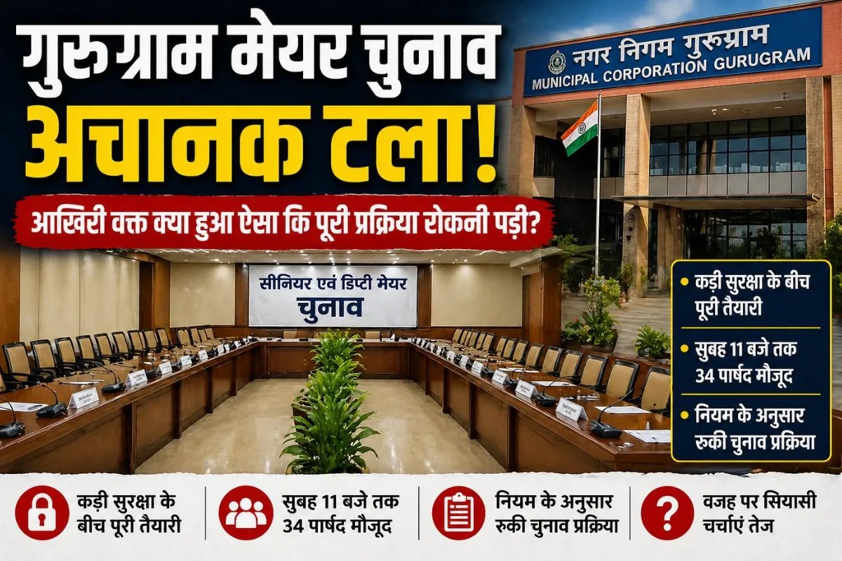 Gurugram Mayor Election: गुरुग्राम नगर निगम में गुरुवार को होने वाला सीनियर और डिप्टी मेयर का चुनाव अचानक टल गया, जिससे पूरे माहौल में हलचल मच गई। सुबह से ही अंदर काफी चहल-पहल थी, कड़ी सुरक्षा थी और सभी पार्षद भी पहुंच चुके थे, मतलब सब कुछ चुनाव के लिए तैयार था। लेकिन ठीक आखिरी समय पर कुछ ऐसा हुआ कि पूरी प्रक्रिया रोकनी पड़ी। इस अचानक फैसले से पार्षद ही नहीं, बल्कि राजनीतिक गलियारों में भी तरह-तरह की बातें होने लगी हैं। वहीं बुधवार को दिल्ली में MCD चनाव में बीजेपी ने जीत हासिल की है।