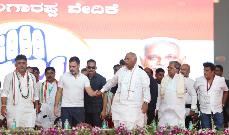 AICC President Mallikarjuna Kharge, Chief Minister of Karnataka Siddaramaiah, DCM DK Shivakumar and Congress leader Rahul Gandhi during a public meeting for the Congress Lok Sabha Candidate Geetha Shivarajkumar at Shimoga, in Shimoga on Thursday 2nd May 2024