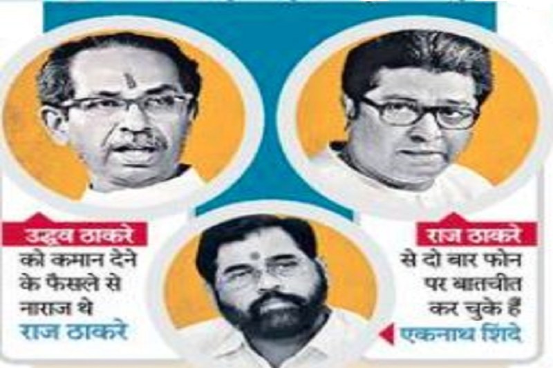 सत्ताधारी शिवसेना में बगावत के बाद महाराष्ट्र में नए सियासी समीकरण के संकेत हैं। ठाणे के कद्दावर नेता एकनाथ शिंदे के नेतृत्व में बागी विधायक राज ठाकरे की महाराष्ट्र नव निर्माण सेना (मनसे) में शामिल हो सकते हैं। ऐसा हुआ तो महाराष्ट्र में शिवसेना को लेकर चल रही उद्धव बनाम शिंदे की लड़ाई ठाकरे बनाम ठाकरे में तब्दील हो जाएगी। गुवाहाटी के होटल में डेरा जमाए शिंदे के साथ 49 विधायक हैं। इनमें 39 एमएलए शिवसेना के हैं। सर्जरी के बाद आराम कर रहे मनसे मुखिया राज ठाकरे से शिंदे दो बार फोन पर बातचीत कर चुके हैं। इस तरह की अटकलें शिंदे गुट या मनसे की ओर से खारिज नहीं की गई हैं।