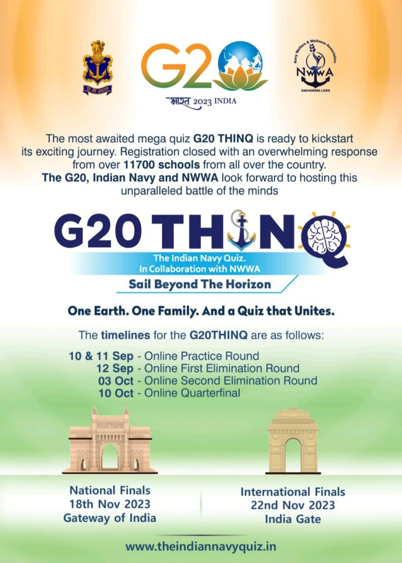राष्ट्रीय व अंतरराष्ट्रीय 'जी-20 थिंक' क्विज का आयोजन जी-20 सचिवालय के तत्वावधान में नौसेना कल्याण और कल्याण संघ (एनडब्ल्यूडब्ल्यूए) व नौसेना की ओर से किया जा रहा है। इसके राष्ट्रीय दौर में नौवीं से बारहवीं कक्षा के स्कूली बच्चे भाग लेंगे। क्विज के लिए 11700 से अधिक स्कूलों ने पंजीकरण कराया है।