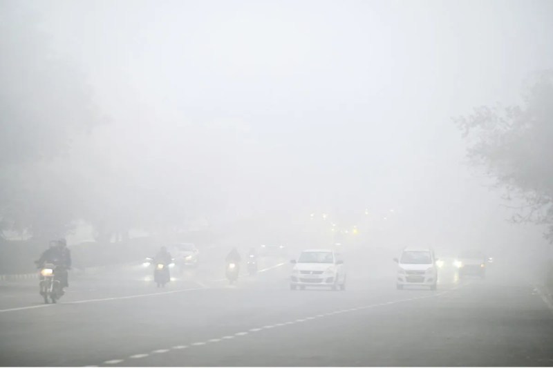 नोएडा में 29 दिंसबर 2025 को कड़ाके की ठंड और घने कोहरे के बीच रेंगते वाहन। (Photo: IANS)