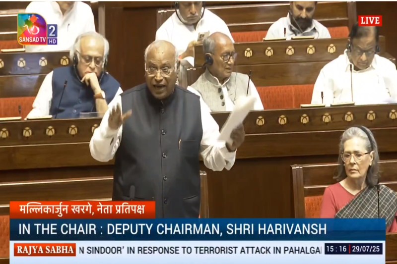 Parliament Monsoon Session: संसद के मानसून सत्र में मंगलवार को 'ऑपरेशन सिंदूर' पर चर्चा के दौरान राज्यसभा में विपक्ष के नेता और कांग्रेस अध्यक्ष मल्लिकार्जुन खड़गे ने प्रधानमंत्री नरेंद्र मोदी पर जमकर निशाना साधा। खड़गे ने सरकार पर विपक्ष की आवाज को दबाने का आरोप लगाते हुए कहा कि आज लोकतंत्र की आत्मा को कुचलने की कोशिश की जा रही है।