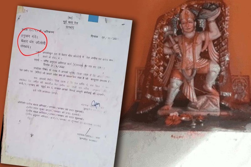 रेलवे अधिकारियों की लापरवाही का यह मामला झारखंड के धनबाद जिले से सामने आया है। यहां ईस्ट सेंट्रल रेलवे ने हनुमान मंदिर के बाहर यह नोटिस चिपकाया है। नोटिस हनुमान जी के नाम से है और उसमें लिखा गया है कि आपका मंदिर रेलवे की जमीन पर है। वहां अवैध कब्जा किया गया है। नोटिस मिलने के 10 दिनों के अंदर मंदिर हटा लें और जमीन खाली कर दें। नहीं तो आपके खिलाफ कानूनी कार्रवाई की जाएगी।