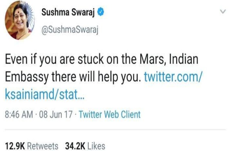 इन दिनों देश की पूर्व विदेश मंत्री सुषमा स्वराज का एक ट्वीट सोशल मीडिया पर फिर से वायरल हो रहा है। सुषमा स्वराज ने एक बार ट्वीट में कहा था कि अगर आप मंगल ग्रह पर भी फंसे हैं तो भी वहां का भारतीय दूतावास आपकी मदद करेगा।