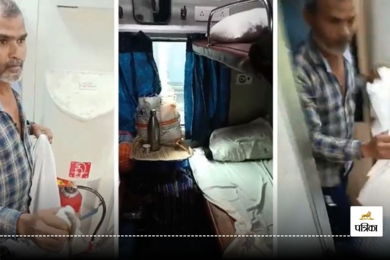 IRCTC के एक कर्मचारी को एक साथी यात्री के साथ मिलकर चादर का उपयोग करके सांप को सुरक्षित रूप से पकड़ने का काम करते हुए देखा जा सकता है।