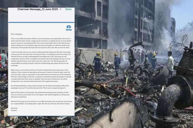 पत्र में टाटा संस के चेयरमैन ने कहा, यह हमारे लिए एक कठिन समय है। कल जो हुआ, उससे हम गहरे शोक में हैं। हमारे लिए किसी एक व्यक्ति को खोना भी त्रासदी है, लेकिन एक साथ इतनी सारी मौतें होना समझ से परे है। चेयरमैन ने यह भी स्पष्ट किया कि टाटा समूह इस हादसे से संबंधित संवाद में पूरी पारदर्शिता बरतेगा और जांच पूरी होने तक किसी निष्कर्ष पर पहुंचने से बचा जाएगा। उन्होंने यह भी कहा कि यूके, यूएस और भारत की जांच एजेंसियों की टीमें अहमदाबाद पहुंच चुकी हैं, और सभी तथ्य सामने आने के बाद ही किसी निष्कर्ष पर पहुंचा जाएगा।