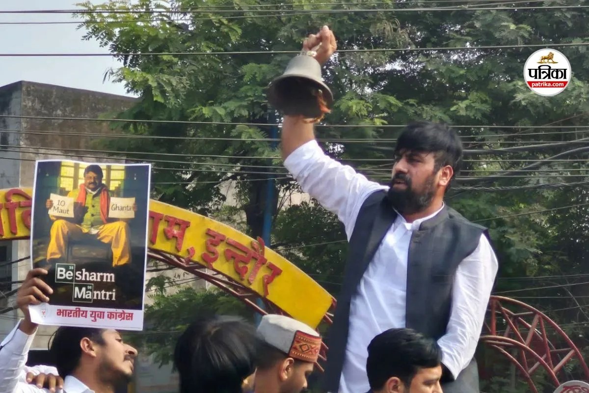 इंदौरः दूषित पानी से मौत मामले में युवक कांग्रेस ने पीतल का घंटा लेकर नगर निगम मुख्यालय पर प्रदर्शन किया ( फोटो सोर्स- पत्रिका)