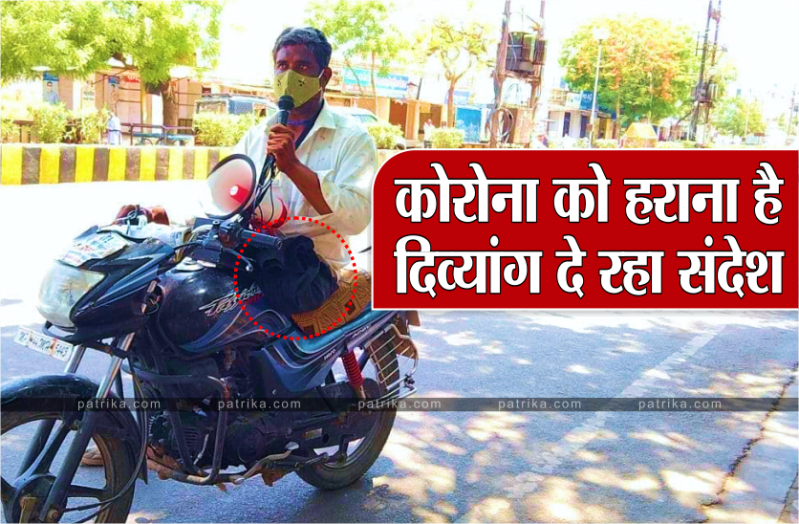 नीमच शहर में एक ऐसा नजारा देखने को मिला, जिसके बारे में जानकर आप के अंदर भी इस महामारी को हराने का जज्बा पैदा हो जाएगा। जावद निवासी एक दिव्यांग युवक जन-जागरूकता अभियान चला रहा है। यह युवक रामप्रकाश बलदेवा है, जो एक पैर से दिव्यांग हैं, लेकिन हौसला इतना मजबूत है कि इस विकट परिस्थिति के दौर में भी अपनी मोटर साइकिल पर सवार होकर अपने खर्चे से जन अभियान परिषद् कोरोना वालेंटियर के रूप में नीमच मंदसौर जि़ले की जनता को कोरोना से बचाने के लिए जागरूक कर रहा है। पत्रिका से बातचीत करते हुए दिव्यांग रामप्रकाश बलदेवा ने कहा कि कोरोना को हराने का एकमात्र तरीका एहतियात है और इससे बचने के लिए सरकार की गाइडलाइन का पालन करना चाहिए। उन्होंने बताया कि मैं एक पैर से दिव्यांग होकर जन जागरूकता कर सकता हूं तो अन्य सामाजिक कार्यकर्ता भी इस कार्य के लिए आगे आएं और जनता को जागरूक करें।