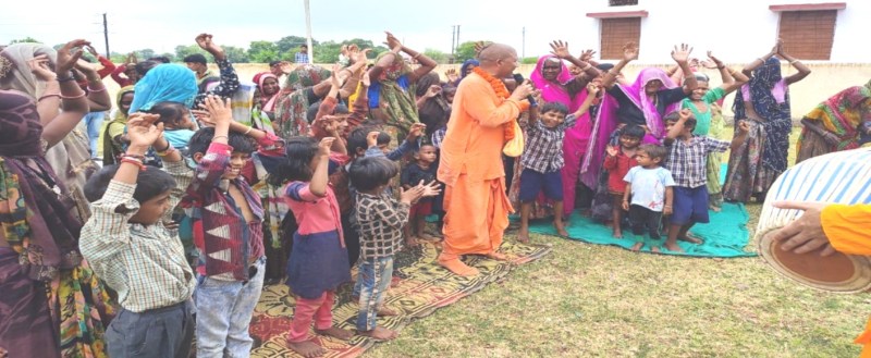 गांव में स्नेह यात्रा के दौरान ग्रामीणों को संबोधित करते हुए संतश्री।