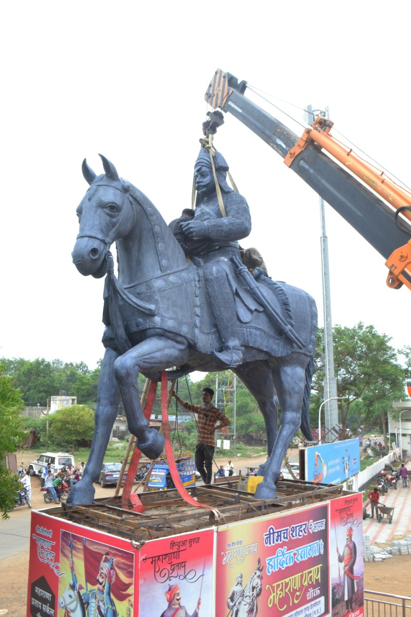 नीमच। देश की शौर्य महापुरूष महाराणा प्रताप की प्रतिमा आखिरकार नीमच शहर के मुख्य ग्वालटोली चौराहा पर शुक्रवार को स्थापित हो गई। मूर्ति की स्थापना को लेकर राजपूत समाज पिछले 11 वर्ष से प्रयासरत था। दो नगर पालिका के अध्यक्ष के कार्यकाल भी समाप्त हो गए। लेकिन मूर्ति की स्थापना में लेटलतीफी हो रही थी। तभी राजपूत समाज के इसका बेडा उठाया और जनसहयोग से आखिरकार उसे शहर चौराहे पर स्थापित कराया।