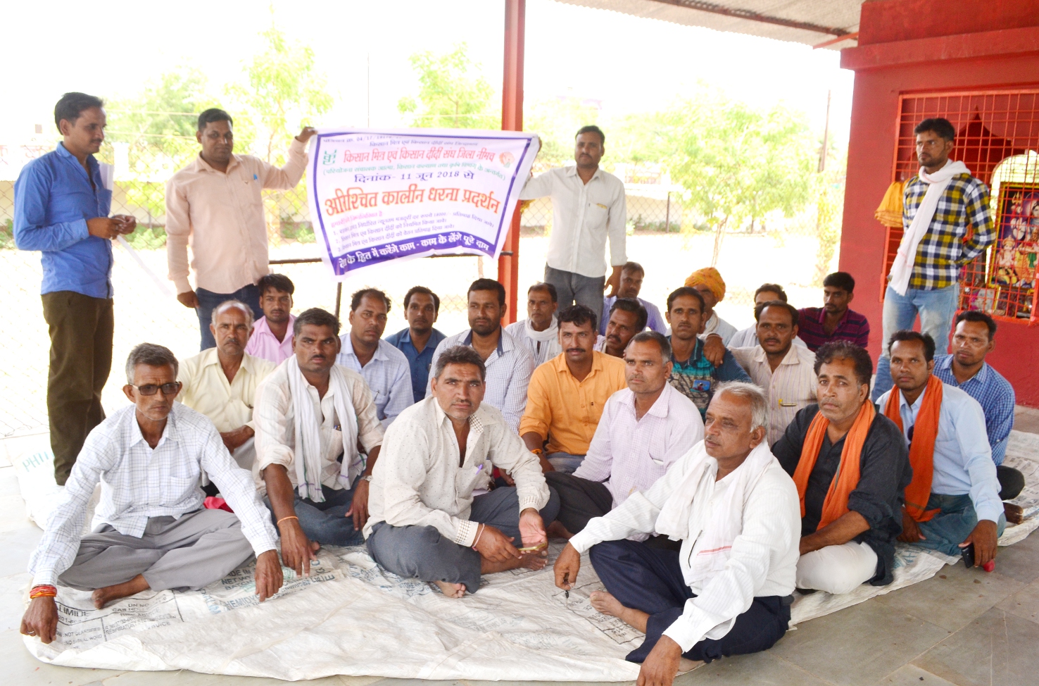कलेक्टोरेट परिसर स्थित मंदिर पर अपनी ६ सूत्रीय मांगों को लेकर सोमवार से धरने पर बैठे किसान मित्र और किसान दीदी संघ के सदस्यगण।