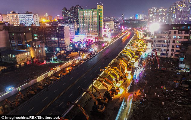 नैनचांग में 1640 फीट लंबे हांग्दू एवेन्यू, ओवरब्रिज को 200 बुल्डोजरों ने एक साथ काम करते हुए 8 घंटे में गिरा दिया। इतना ही नहीं रात में ब्रिज को गिराने के बाद सुबह यातायात भी शुरू कर दिया गया।