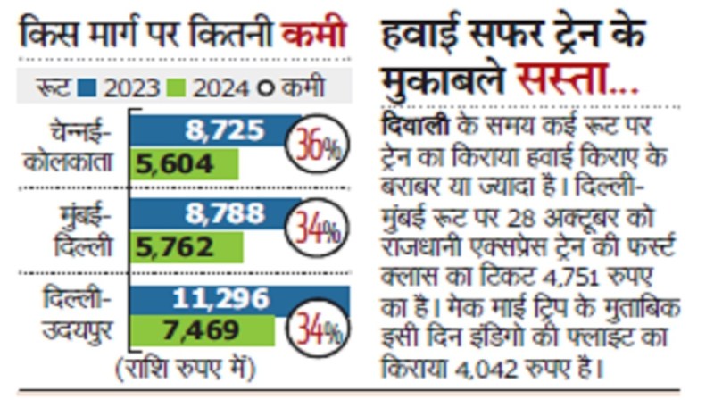 नई दिल्ली. दिवाली की छुट्टियों में सफर करने वालों के लिए खुशखबर है। कई रूट पर हवाई किराया पिछले साल के दिवाली सीजन के मुकाबले 20 से 25 फीसदी तक घट गया है। यह गिरावट घरेलू मार्गों के लिए है। किराए में कमी यात्रियों की बढ़ती क्षमता और तेल की कीमतें घटने के कारण हुई। कई रूट पर हवाई किराया ट्रेन के किराए से भी कम है।