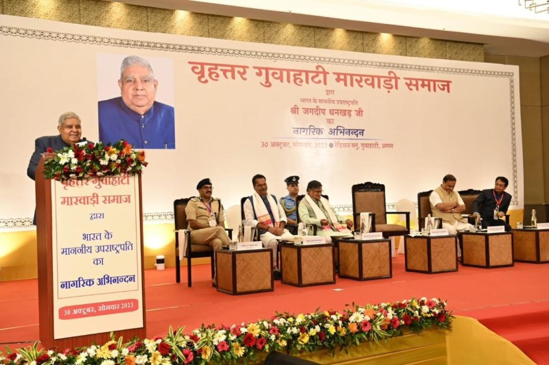 नई दिल्ली। गुवाहाटी यात्रा पर गए उप राष्ट्रपति जगदीप धनखड़ का सोमवार को वृहत्तर गुवाहाटी मारवाड़ी समाज की ओर से नागरिक अभिनंदन किया गया। इस अवसर पर आयोजित कार्यक्रम को सम्बोधित करते हुए धनखड़ ने कहा कि देश के विकास में मारवाड़ी समाज का बड़ा योगदान है।