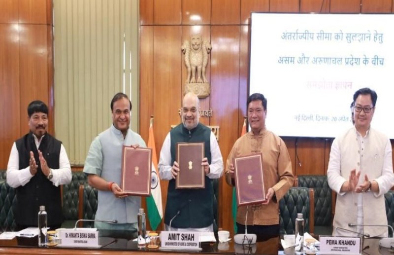 गृह मंत्री अमित शाह की मौजूदगी में सीमा विवाद हल करने के समझौते पर असम के सीएम हेमंत बिस्वा शर्मा और अरुणाचल के सीएम पेमा खांडू ने समझौते पर हस्ताक्षर किए।