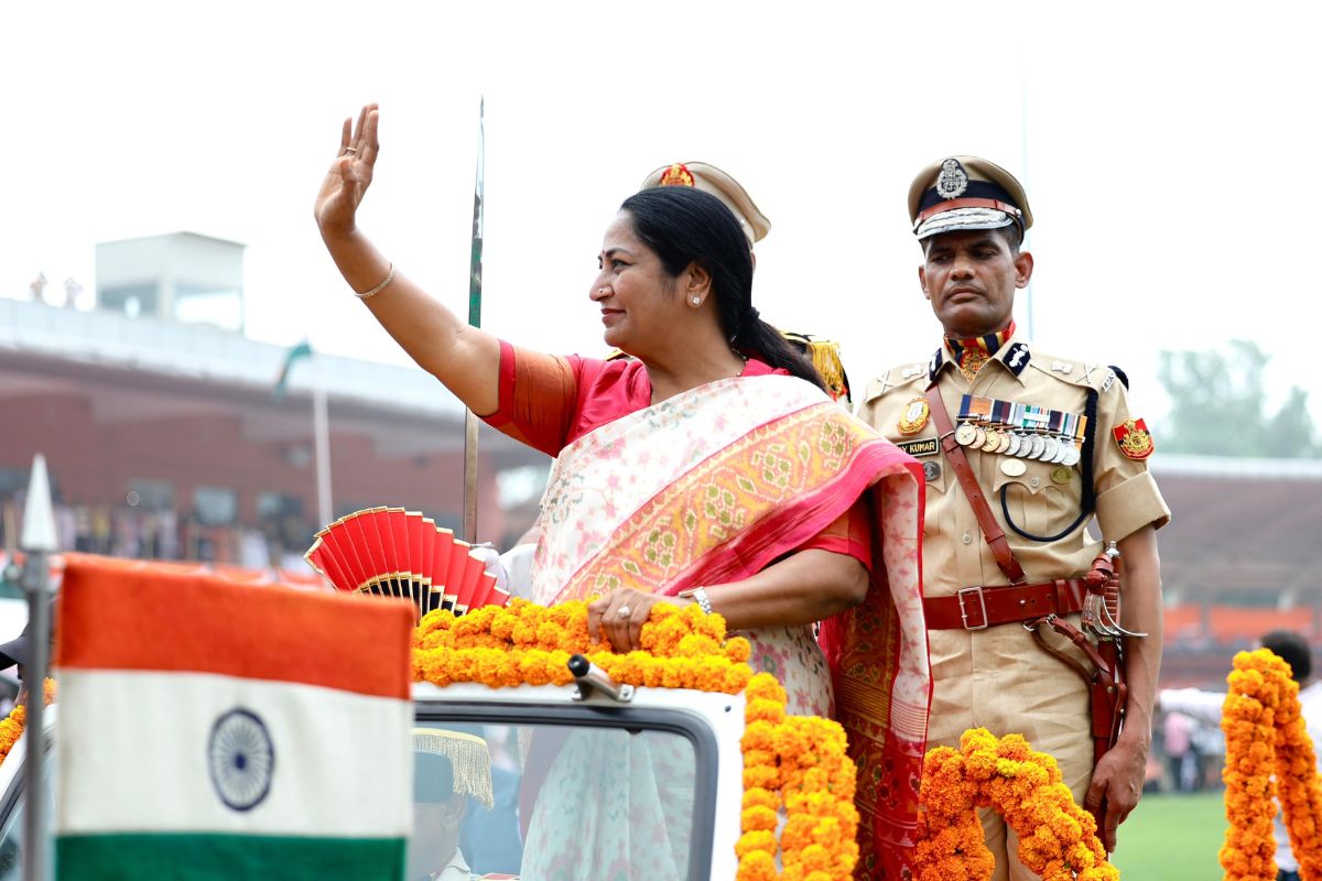 दिल्ली के छत्रपाल स्टेडियम में आयोजित 79वें स्वतंत्रता दिवस समारोह में सीएम रेखा गुप्ता। (फोटो : @gupta_rekha)