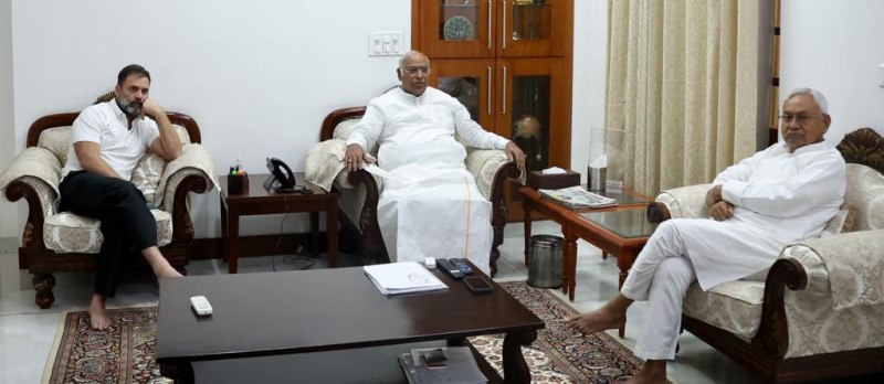 कांग्रेस अध्यक्ष मल्लिकार्जुन खरगे के आवास पर बिहार के मुख्यमंत्री नीतीश कुमार और जेडीयू अध्यक्ष ललन सिंह और बिहार सरकार में मंत्री संजय झा पहुंचे। जहां कांग्रेस अध्यक्ष खरगे, कांग्रेस नेता राहुल गांधा, संगठन महासचिव के.सी.वेणुगोपाल के साथ करीब एक घंटे से अधिक समय तक बैठक चली। बैठक में विपक्षी एकता को मजबूत करने और अधिक से अधिक दलों को जोडऩे की रणनीति पर चर्चा की गई। सूत्रों ने बताया कि बैठक में दिल्ली सरकार के ट्रांसफर-पोस्टिंग मसले पर भी चर्चा हुई। कांग्रेस भी केन्द्र सरकार के अध्यादेश के खिलाफ खड़ी होने को तैयार है। इसके अलावा अन्य मुद्दों को लेकर भी चर्चा हुई। कांग्रेस ससंगठन महासचिव वेणुगोपाल ने कहा कि विपक्षी एकता को लेकर चर्चा हुई है। एक-दो दिन में विपक्षी दलों की बैठक की तारीख व स्थान की घोषणा की जाएगी।