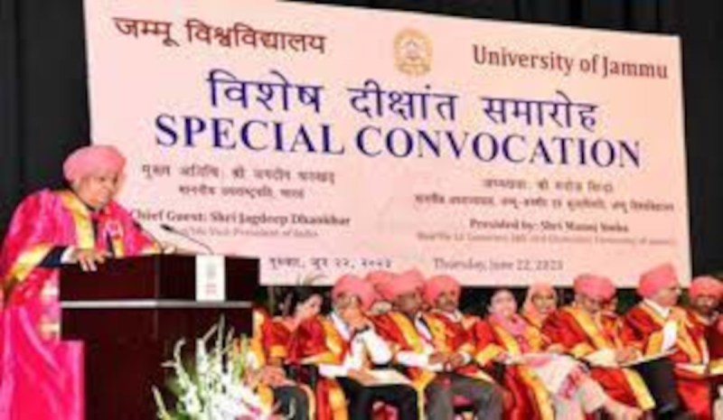 धनखड़ ने किसी का नाम लिए बिना निशाना साधा कि देश को नीचा दिखाने के लिए सुनियोजित तरीके से झूठी कहानियां फैलाई जा रही हैं, लेकिन कुछ लोग इसे गंभीरता से नहीं लेते। उन्होंने सभी से हमारी विकास गाथा को कम करने के खतरनाक मंसूबों को हल्के में न लेने की अपील करते हुए कहा कि प्रत्येक भारतीय को देश की उपलब्धियों पर गर्व करना चाहिए। दीक्षांत समारोह में उपराष्ट्रपति की पत्नी सुदेश धनखड़, जम्मू कश्मीर के उप राज्यपाल मनोज सिन्हा, जम्मू विश्वविद्यालय के प्रो-चांसलर आलोक कुमार व कुलपति प्रो. उमेश राय समेत कई गणमान्य नागरिक मौजूद थे।
