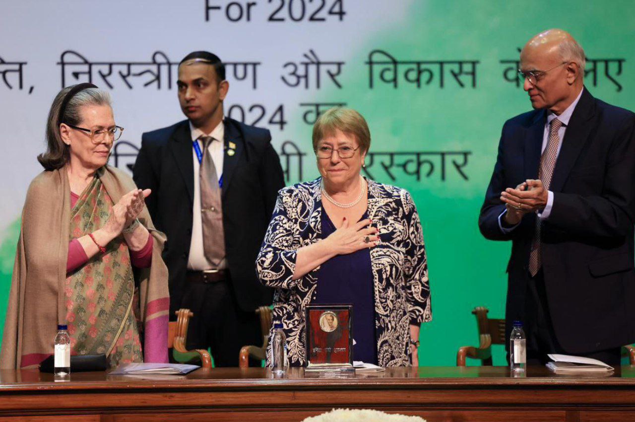 बैचलेट को पुरस्कार प्रदान करते हुए सोनिया गांधी ने उनके न केवल अपने देश के लिए, बल्कि वैश्विक शांति के लिए उत्कृष्ट योगदान को याद किया। उन्होंने कहा कि बैचलेट ने अपने शुरुआती वर्षों में क्षति, उत्पीड़न, यातना और निर्वासन को प्रत्यक्ष रूप से देखा है।उन्होंने कहा कि यह एक उल्लेखनीय संयोग है कि इंदिरा गांधी और बैचलेट दोनों महिलाएं अशांति के दौर में पैदा हुईं और पली-बढ़ीं।