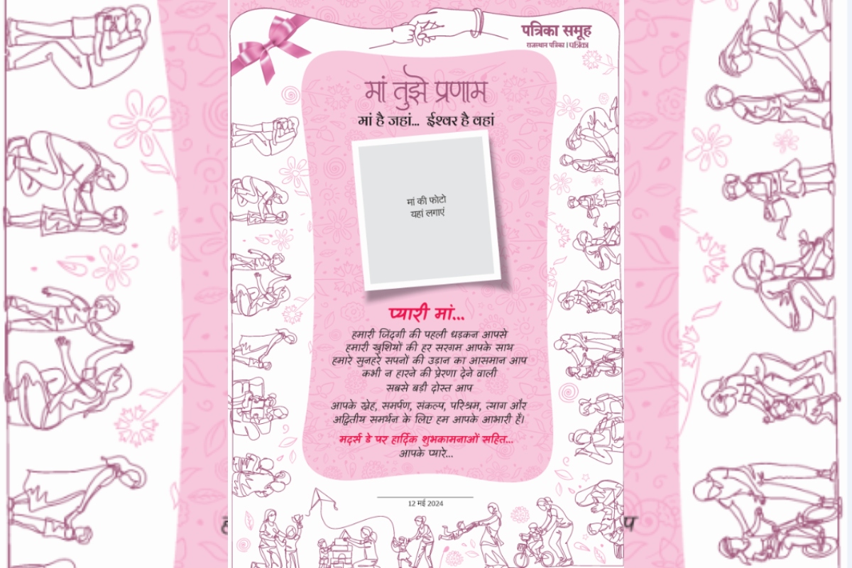 मदर्स डे पर पत्रिका समूह आपको दे रहा है मां को सम्मानित करने का मौका। मां के स्नेह, समर्पण, संकल्प, त्याग और अद्वितीय समर्थन के प्रति आभार प्रकट करता विशेष रूप से डिजाइन सम्मान पत्र ‘मां तुझे प्रणाम’ को क्यूआर कोड स्कैन कर डाउनलोड कर लें। इसमें दी गई स्पेस में मां का फोटो लगाकर प्रिंट निकलवा लें और मां को भेंट करके उन्हें उनकी महत्वपूर्ण भूमिका का अहसास कराएं। सम्मान पत्र के नीचे आप अपना नाम भी लिखें और इसे फ्रेम करवाकर हमेशा के लिए यादगार भी बनाएं। मां का सम्मान करते हुए फोटो सोशल मीडिया पर #mothersday2024 तथा #patrikahonour के साथ शेयर भी करें।