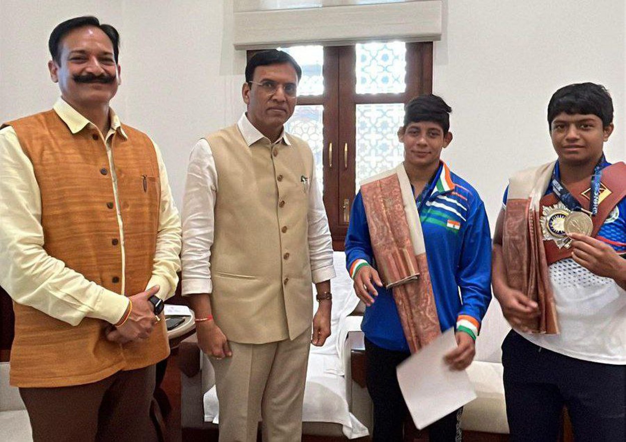 नई दिल्ली। अंडर-17 कुश्ती विश्व चैंपियनशिप में शानदार प्रदर्शन करने वाले अश्विन और कोमल वर्मा ने संसद भवन का भ्रमण किया। इस दौरान राजस्थान कुश्ती संघ के अध्यक्ष राजीव दत्ता ने खिलाड़ियों का मनोबल बढ़ाया। खिलाड़ियों की केंद्रीय खेल मंत्री मनसुख मांडविया, केंद्रीय खेल राज्य मंत्री रक्षा खड़से, महाराष्ट्र विधान सभा अध्यक्ष राहुल नार्वेकर और सांसद जगदंबिका पाल से मुलाक़ात हुई।