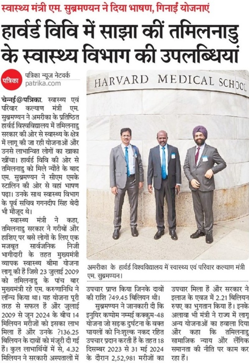 चेन्नई. स्वास्थ्य एवं परिवार कल्याण मंत्री एम. सुब्रमण्यन ने अमरीका के प्रतिष्ठित हार्वर्ड विश्वविद्यालय में तमिलनाडु सरकार की ओर से स्वास्थ्य के क्षेत्र में लागू की जा रही योजनाओं और उनसे लाभान्वित लोगों का खाका खींचा। हार्वर्ड विवि की ओर से तमिलनाडु को मिले न्यौते के बाद एम. सुब्रमण्यन ने सीएम एमके स्टालिन की ओर से वहां भाषण पढ़ा। उनके साथ स्वास्थ्य विभाग के पूर्व सचिव गगनदीप सिंह बेदी भी मौजूद थे।