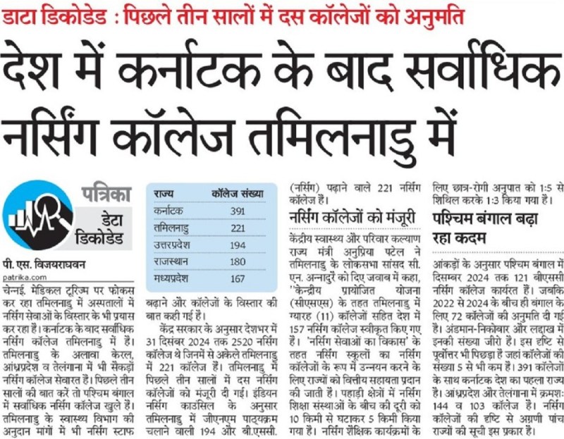 चेन्नई. मेडिकल टूरिज्म पर फोकस कर रहा तमिलनाडु में अस्पतालों में नर्सिंग सेवाओं के विस्तार के भी प्रयास कर रहा है। कर्नाटक के बाद सर्वाधिक नर्सिंग कॉलेज तमिलनाडु में है। तमिलनाडु के अलावा केरल, आंध्रप्रदेश व तेलंगाना में भी सैकड़ों नर्सिंग कॉलेज सेवारत हैं। पिछले तीन सालों की बात करें तो पश्चिम बंगाल में सर्वाधिक नर्सिंग कॉलेज खुले हैं। तमिलनाडु के स्वास्थ्य विभाग की अनुदान मांगों में भी नर्सिंग स्टाफ बढ़ाने और कॉलेजों के विस्तार की बात कही गई है।