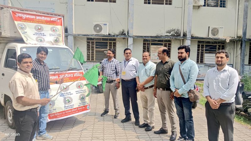 बांसवाड़ा . आयुष्मान आरोग्य मंदिर रथ को हरीझंडी दिखाकर रवाना करते अधिकारी।