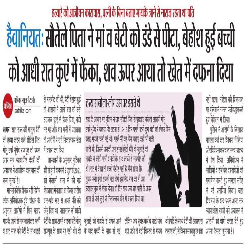 सागर. सात साल की मासूम बेटी की हत्या करने वाले आरोपी सौतेले पिता मोनू उर्फ भूपेंद्र राजपूत को प्रथम अपर सत्र न्यायाधीश देवरी की अदालत नेे आजीवन कारावास की सजा सुनाई है। मामले की पैरवी कर रहीं विशेष लोक अभियोजक वृंदा चौहान के अनुसार आरोपी ने बिना बताए मायके जाने से नाराज होकर पत्नी व सात साल की बेटी के साथ डंडे से मारपीट की थी, मारपीट के चलते बेटी बेहोश हुई तो आरोपी ने आधी रात को उसे उठाकर कुआं में फेंक दिया था, इसके बाद जब शव पानी में उतराया तो आरोपी ने खेत में दफन कर दिया।