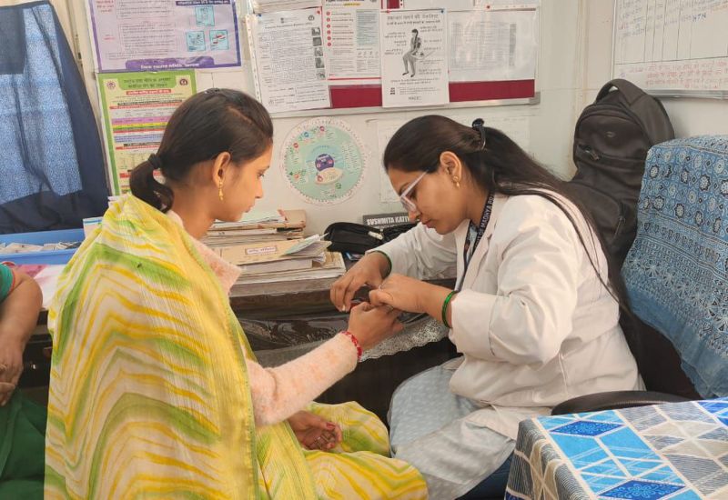 उप स्वास्थ्य केंद्र पर बीपी, शुगर, फैटी लीवर की जांच करते नर्सिंग स्टाफ