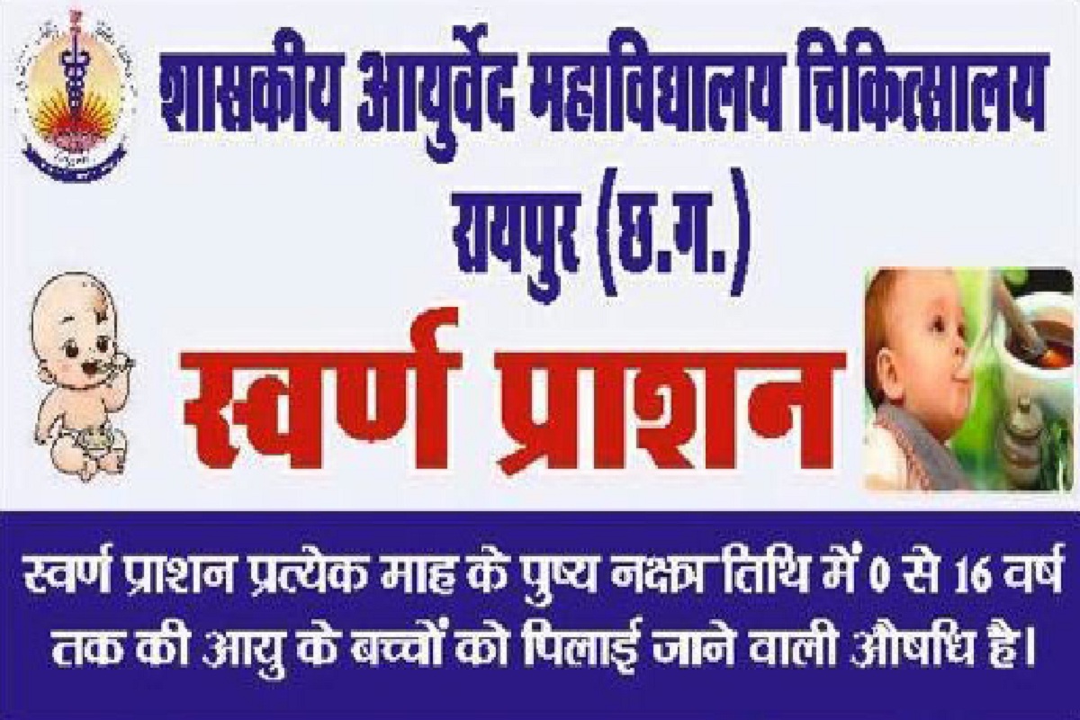 पुष्य नक्षत्र (Pushya Nakshatra) पर 10 मार्च को छत्तीसगढ़ की राजधानी रायपुर के शासकीय आयुर्वेद महाविद्यालय चिकित्सालय में स्वर्ण प्राशन किट तथा बाल रक्षा किट का वितरण किया जाएगा। साथ ही शून्य से 16 वर्ष तक के बच्चों का स्वर्णप्राशन (Swarna Prashana) भी कराया जाएगा। पुष्य नक्षत्र पर स्वर्णप्राशन के लिए आयुर्वेद महाविद्यालय चिकित्सालय पहुंचने वाले पहले 800 बच्चों को अखिल भारतीय आयुर्वेद संस्थान नई दिल्ली (All India Institute of Ayurveda, Delhi) से प्राप्त स्वर्णप्राशन किट एवं बाल रक्षा किट वितरित किए जाएंगे। सुबह 10 बजे से 11.30 बजे तक इनका वितरण किया जाएगा। इसके लिए बच्चे के आधार कार्ड के साथ माता-पिता का मोबाइल नंबर दर्ज कराना होगा।