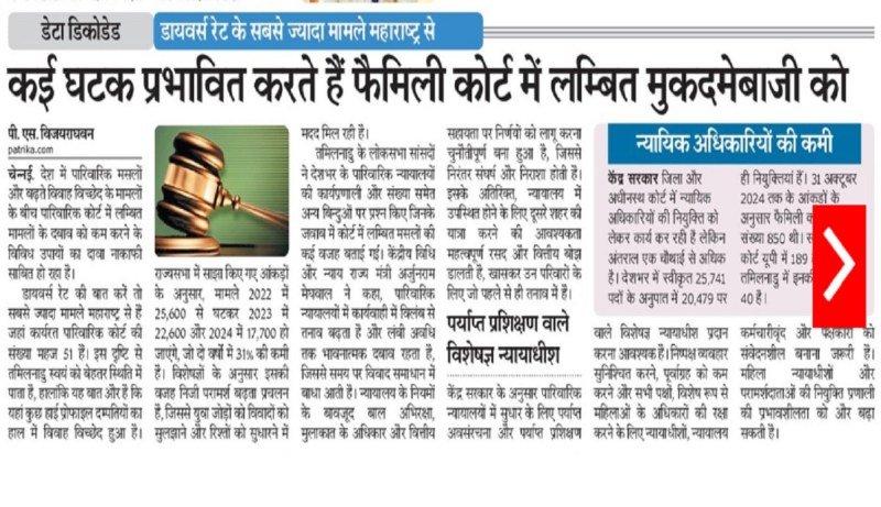 तमिलनाडु के लोकसभा सांसदों ने देशभर के पारिवारिक न्यायालयों की कार्यप्रणाली और संया समेत अन्य बिन्दुओं पर प्रश्न किए जिनके जवाब में कोर्ट में लबित मसलों की कई वजह बताई गईं। केंद्रीय विधि और न्याय राज्य मंत्री अर्जुनराम मेघवाल ने कहा, पारिवारिक न्यायालयों में कार्यवाही में विलंब से तनाव बढ़ता है और लंबी अवधि तक भावनात्मक दबाव रहता है, जिससे समय पर विवाद समाधान में बाधा आती है। न्यायालय के नियमों के बावजूद बाल अभिरक्षा, मुलाकात के अधिकार और वित्तीय सहायता पर निर्णयों को लागू करना चुनौतीपूर्ण बना हुआ है, जिससे निरंतर संघर्ष और निराशा होती है। इसके अतिरिक्त, न्यायालय में उपस्थित होने के लिए दूसरे शहर की यात्रा करने की आवश्यकता महत्वपूर्ण रसद और वित्तीय बोझ डालती है, खासकर उन परिवारों के लिए जो पहले से ही तनाव में हैं।