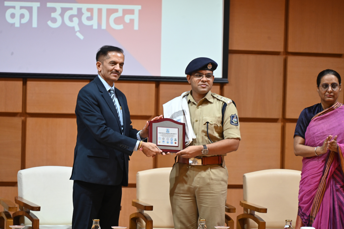 गांधीनगर स्थित राष्ट्रीय रक्षा विश्वविद्यालय के कुलपति डॉ. बिमल पटेल सम्मानित करते हुए।