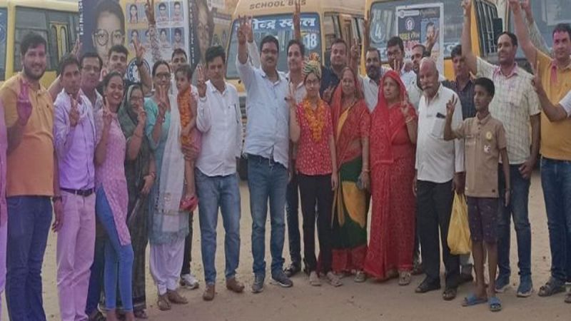 परिणाम के बाद एक स्कूल में जश्न मनाते हुए।