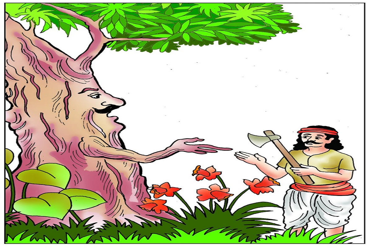एक गांव में एक बड़ा वृक्ष था, जिसके नीचे एक कठोर लकड़हारा रहता था। उस वृक्ष में एक देवता का निवास था जो सभी की सहायता करते थे। एक दिन लकड़हारे ने अपनी कुल्हाड़ी उठाई और वृक्ष को काटने का निर्णय लिया। जैसे ही उसने पहला वार करने की कोशिश की, वृक्ष ने अचानक मानव की तरह बोलना शुरू किया और कहा, मुझे मत काटो, मैं तुम्हारी मदद कर सकता हूं।