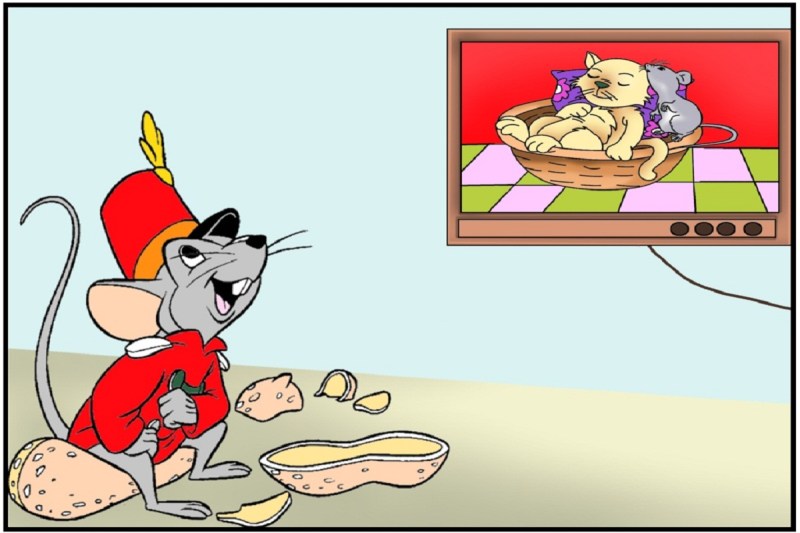एक चूहा था। उसका नाम था निक। वह मूंगफली खा रहा था और टीवी देख रहा था। उसने टीवी पर देखा एक बिल्ली और चूहा साथ-साथ सो रहे हैं। उसने सोचा अब वह भी बिना किसी चिंता के बाहर घूमेगा। बिल्ली कुछ नहीं करेगी। जैसे ही वह बाहर गया। एक बिल्ली ने आवाज लगाई। निक इधर आ।