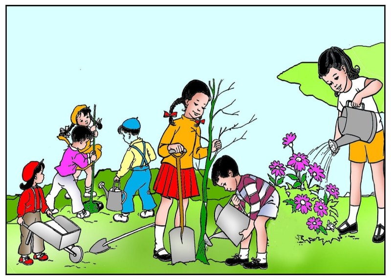 एक स्कूल में पर्यावरण संरक्षण सप्ताह मनाया जा रहा था। इसी अवसर पर शिक्षक ने बच्चों को स्कूल के बगीचे में पेड़-पौधे लगाने और उनकी देखभाल करने का कार्य सौंपा। चित्र में हम देख सकते हैं कि सभी बच्चे बहुत उत्साह के साथ इस कार्य में जुटे हुए हैं। एक बच्चा फूलों के पौधों को पानी दे रहा है, तो एक लड़की पेड़ के पास खड़ी होकर उसे सहारा दे रही है। दो बच्चे मिलकर पेड़ की जड़ में मिट्टी डाल रहे हैं।
