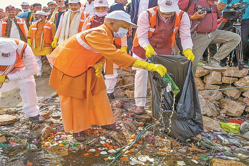 Prayagraj: Uttar Pradesh CM Yogi Adityanath, Deputy CMs Brajesh Pathak, KP Maurya and other ministers of the cabinet participate in a cleanliness drive at Arail Ghat in Prayagraj on Thursday, February 27, 2025. (Photo: IANS)