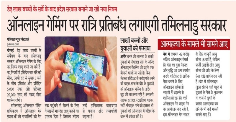 तमिलनाडु ऑनलाइन गेमिंग अथॉरिटी के ताजा सर्वे के प्रारंभिक विश्लेषण के अनुसार राज्य में 20% विद्यार्थी ऑनलाइन गेम के आदी हैं। यह बहुत बड़ी संया है। राज्य के विद्यार्थी जीवन पर पहले ही नशे का ग्रहण लग चुका है। नशे के साथ असामान्य रूप से ऑनलाइन गेम की लत एक पूरी पीढ़ी को बर्बाद कर सकती है। देश के अन्य राज्यों में भी कमोबेस यही हाल है।