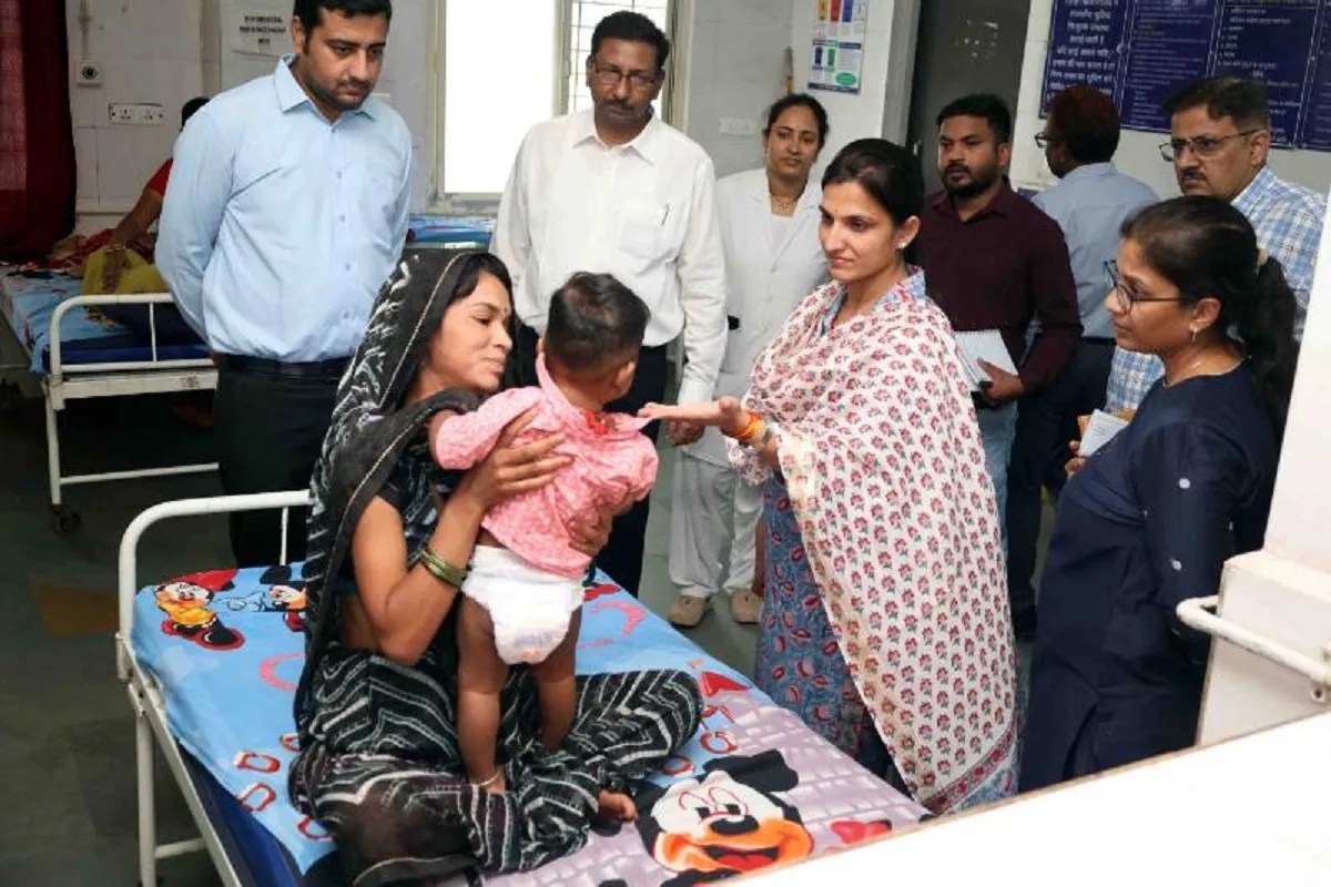अस्पताल के निरीक्षण में बच्चे को दुलारते हुए कलेक्टर।