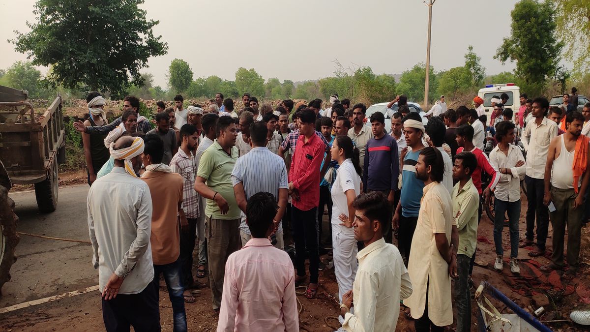 मासलपुर. टै्रक्टर-ट्रॉली पलटने के बाद मौके पर जमा भीड़।