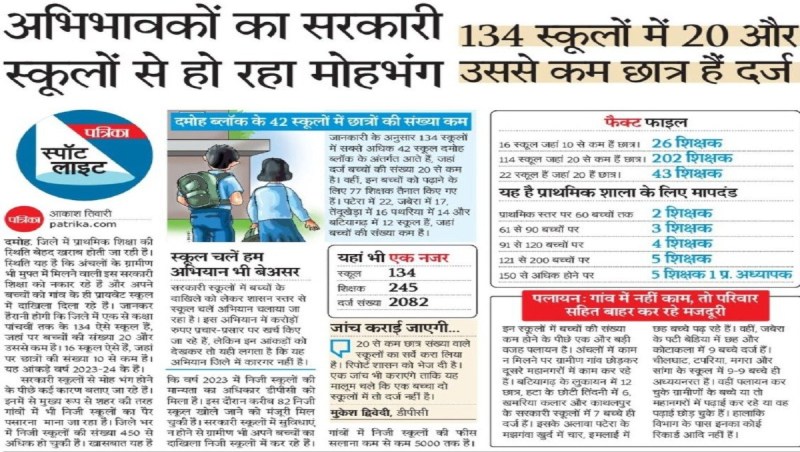 पटेरा ब्लॉक के बमुरिया बनगांव में २०२१-२२ में १६ बच्चे दर्ज थे। पिछले साल २०२३-२४ में यहां पर संख्या घटकर १० हो गई। इसी तरह इमलाई कोटा में ०९ में से सिर्फ ०६ छात्र ही बचे हैं। पथरिया ब्लॉक के पिपरिया लूहर बेरखेड़ी प्राथमिक शाला की बात करें तो यहां भी तीन साल पहले १८ बच्चे दर्ज थे, अब यहां पर दस बच्चे ही दर्ज हैं।